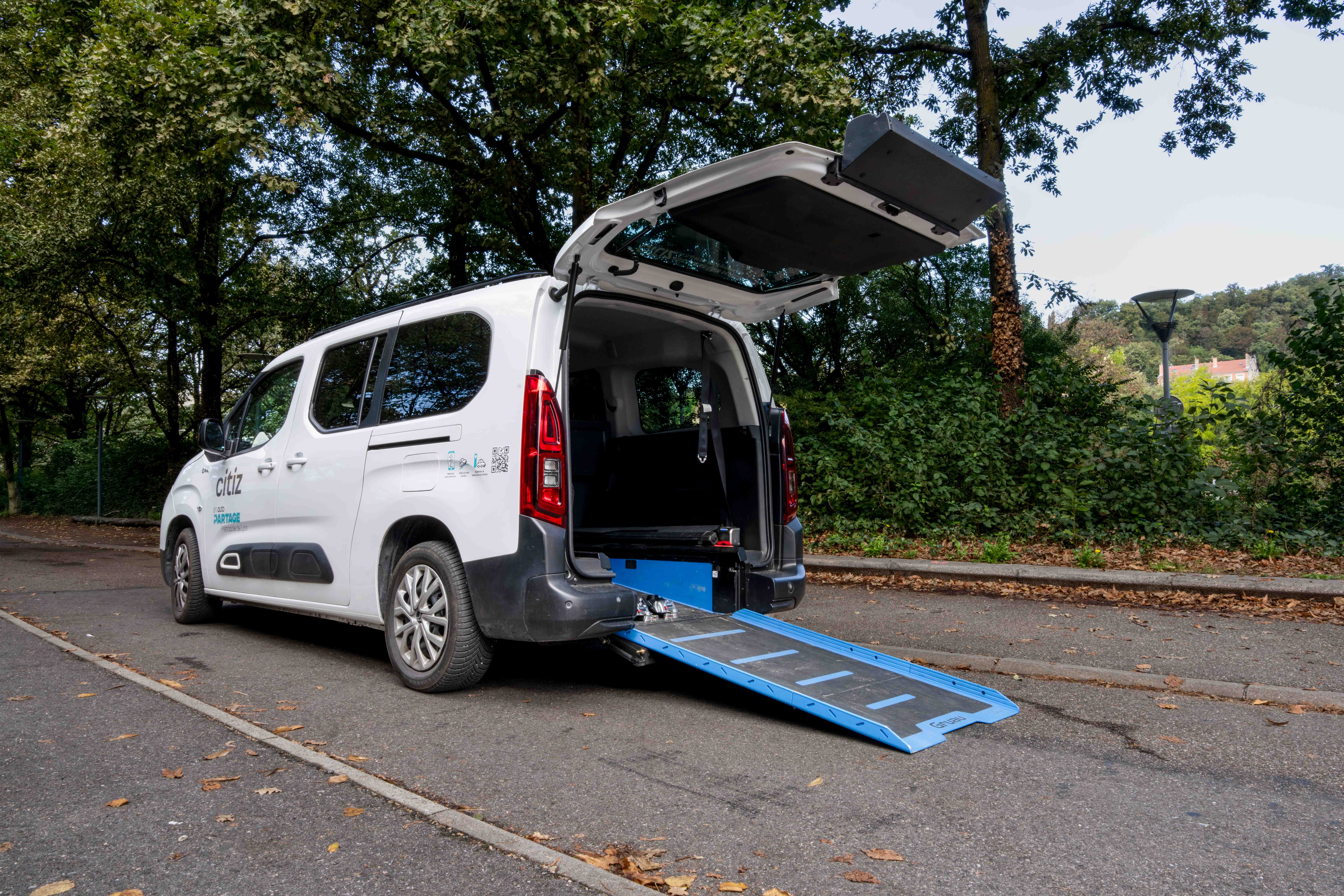 Notre flotte comporte trois Citroën Berlingo adaptés aux transports des personnes à mobilité réduite (TPMR). La rampe d’accès et les aménagements intérieurs permettent à une personne en fauteuil roulant de prendre place très facilement à l’arrière sans avoir à quitter son fauteuil. Ces modèles TPMR permettent de transporter jusqu’à 5 personnes puisqu’il dispose de 2 places à l’arrière en plus de la place réservée au fauteuil.